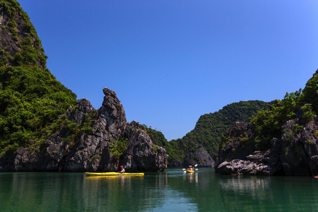 As the day continues, sunlight dances across the limestone cliffs, shifting colors from pale gray to warm gold. Kayaks skim silently along sheltered waters, passing beneath overhangs and through natural arches. Despite its grandeur, Hạ Long Bay never feels rushed; it invites stillness, observation, and a deep connection to nature.